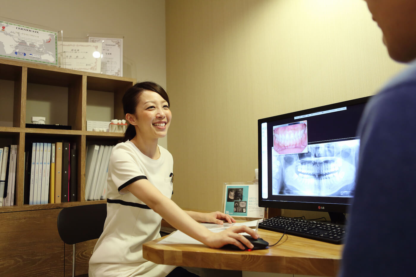 個室のカウンセリングルームで、受診者の方の検査結果を見ながら、インプラント治療の説明と受診者の方の状態を丁寧にご説明いたします。